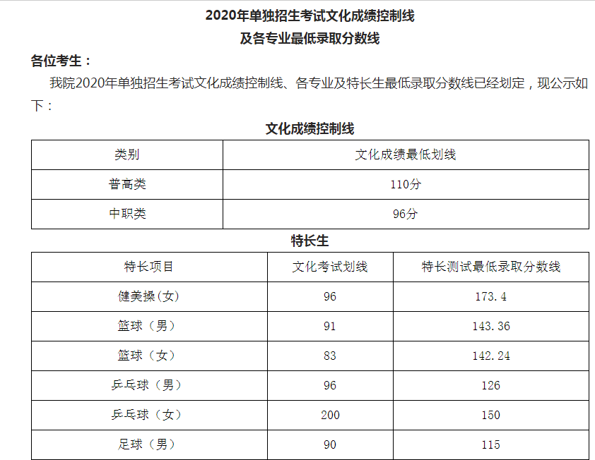 我院2020年单独招生考试文化成绩控制线、各专业及特长生最低录取分数线已经划定,现公示如下:
