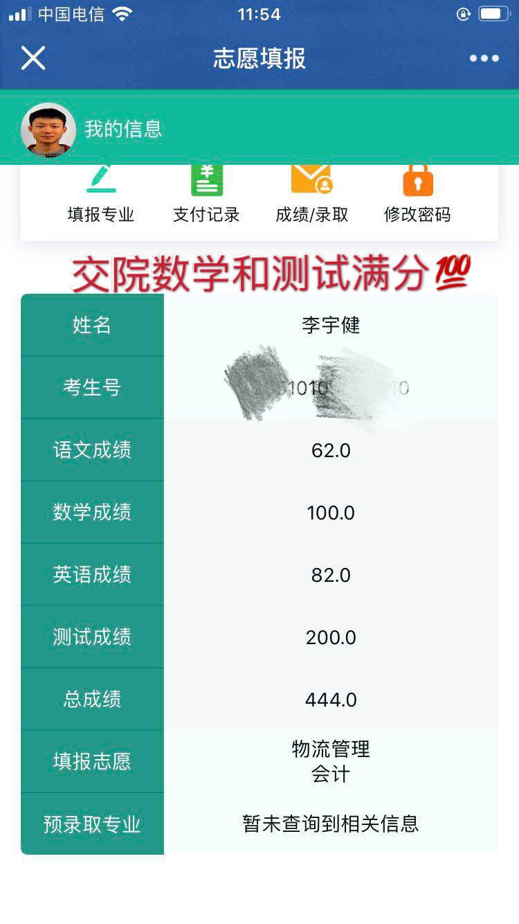 热烈祝贺李宇健同学取得我校第一的优异成绩,并以数学和综合测试双满分的优异成绩被交院录取。