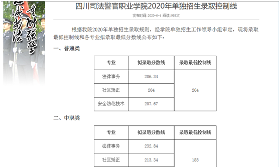 四川司法警官职业学院2020年单招最低录取线