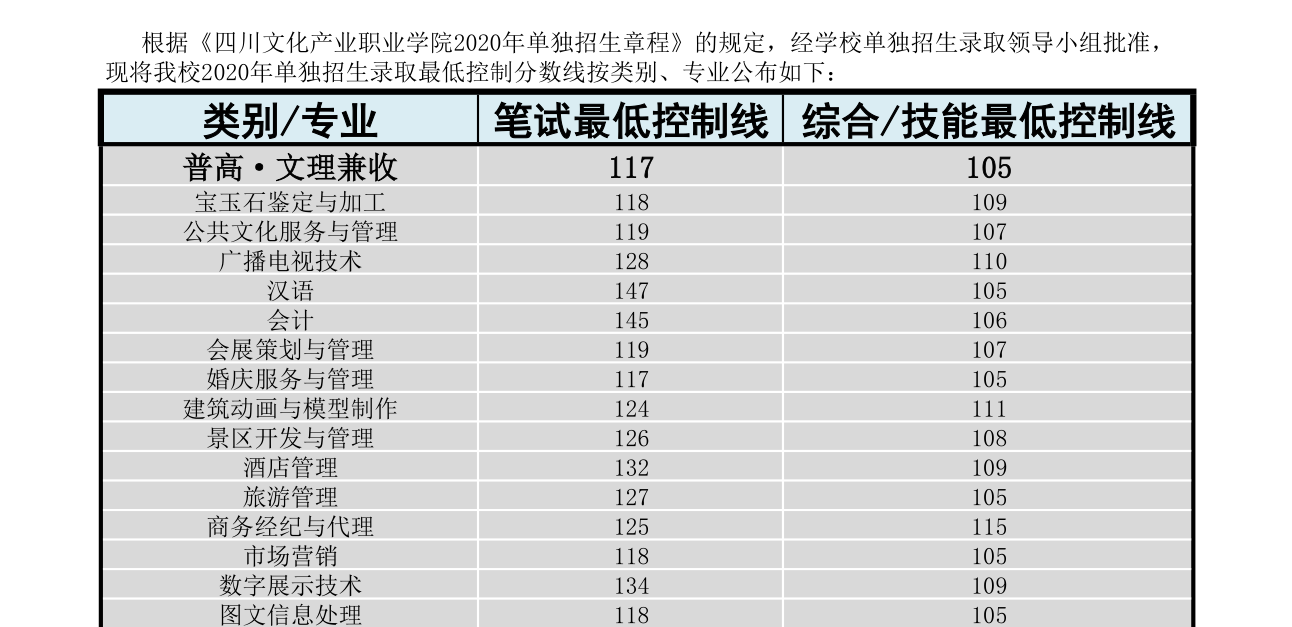 四川文化产业职业学院2020年单招最低调档线