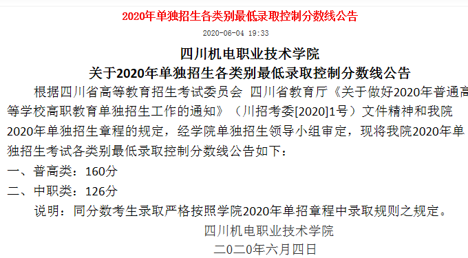 四川机电职业技术学院2020年单独招生各类别最低录取分数线