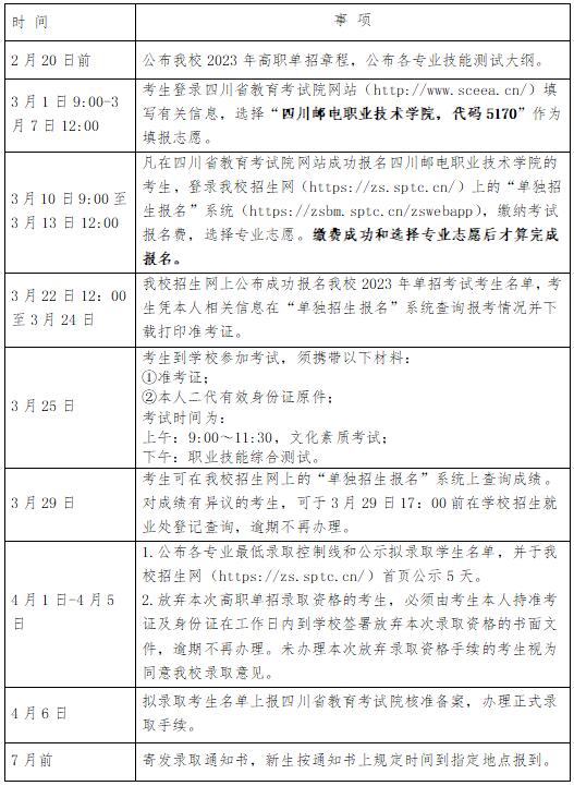 考生本人应于 2023年 3 月 1日 9:00 至 7 日 12:00,登录四川省教育考试院网站(https://www.sceea.cn),按要求准确填写有关信息,选择“四川邮电职业技术学院,代码5170”作为学校志愿。学校志愿设置为 1 个,考生须在规定的时间内在网上填报并及时保存。省教育考试院将在规定的报名时间内,实时公布学校志愿填报情况,考生可根据分学校的志愿填报统计信息,结合本人实际,修改或调整学校志愿。逾期不再补报和更改。