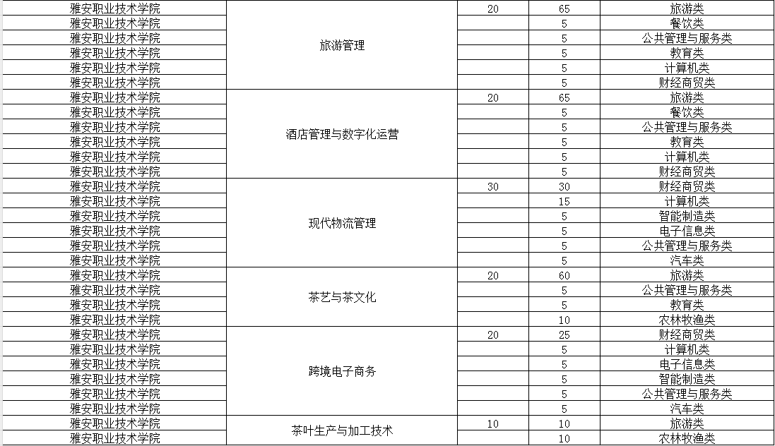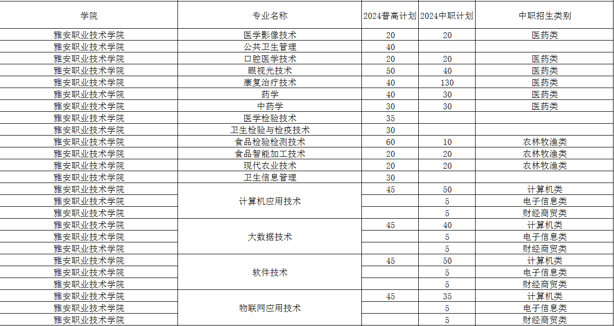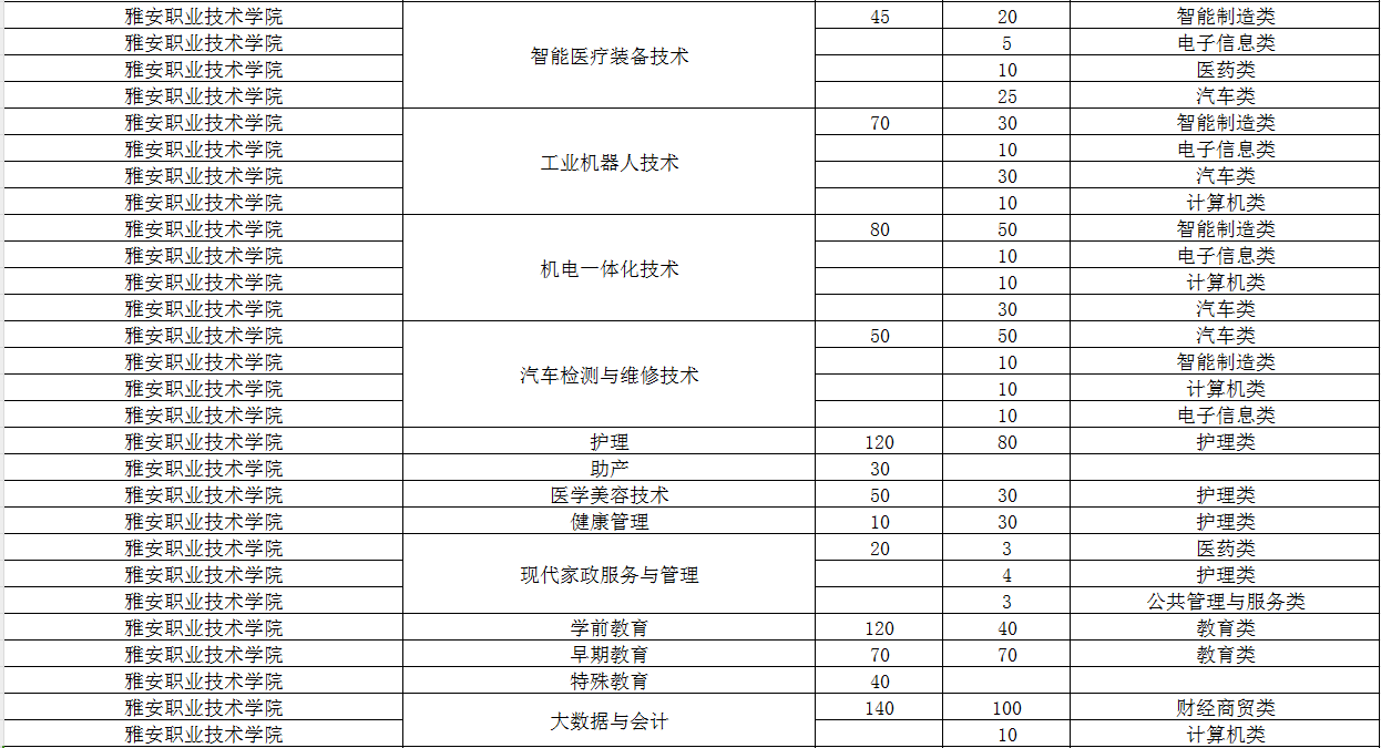雅安职业技术学院2024年单招专业及计划
