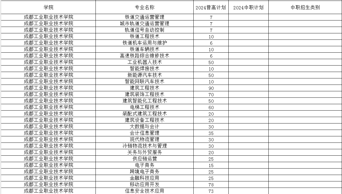 成都工业职业技术学院2024年单招专业及计划