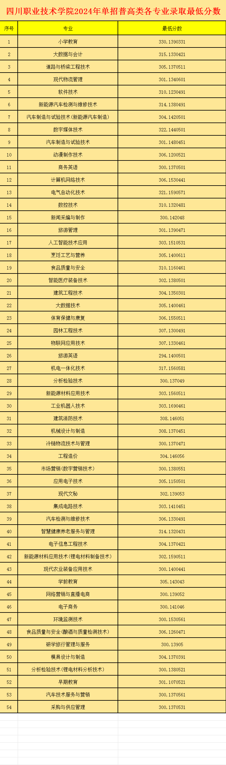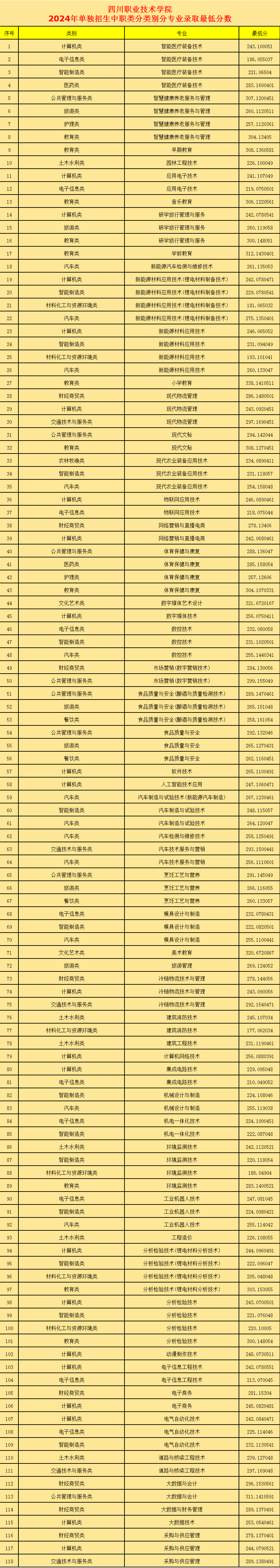 四川职业技术学院2024年单招考试各专业录取最低分数线: