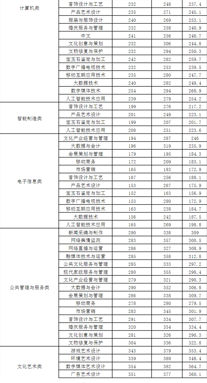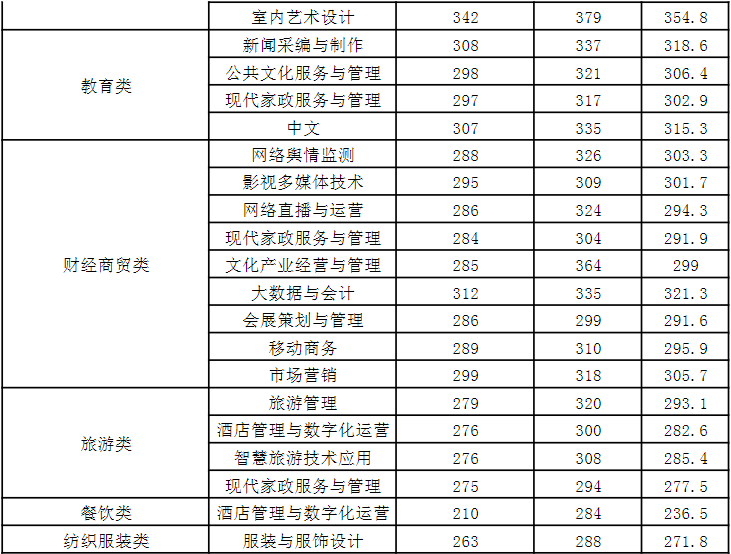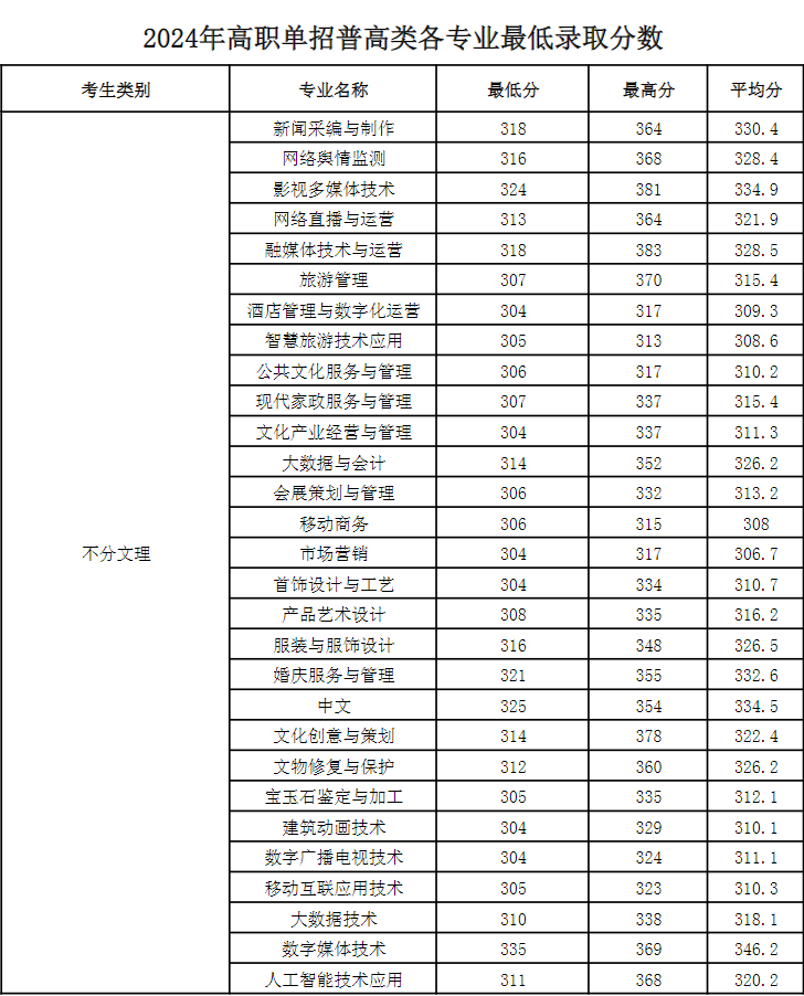 四川文化产业职业学院2024年高职单招各专业最低录取分数: