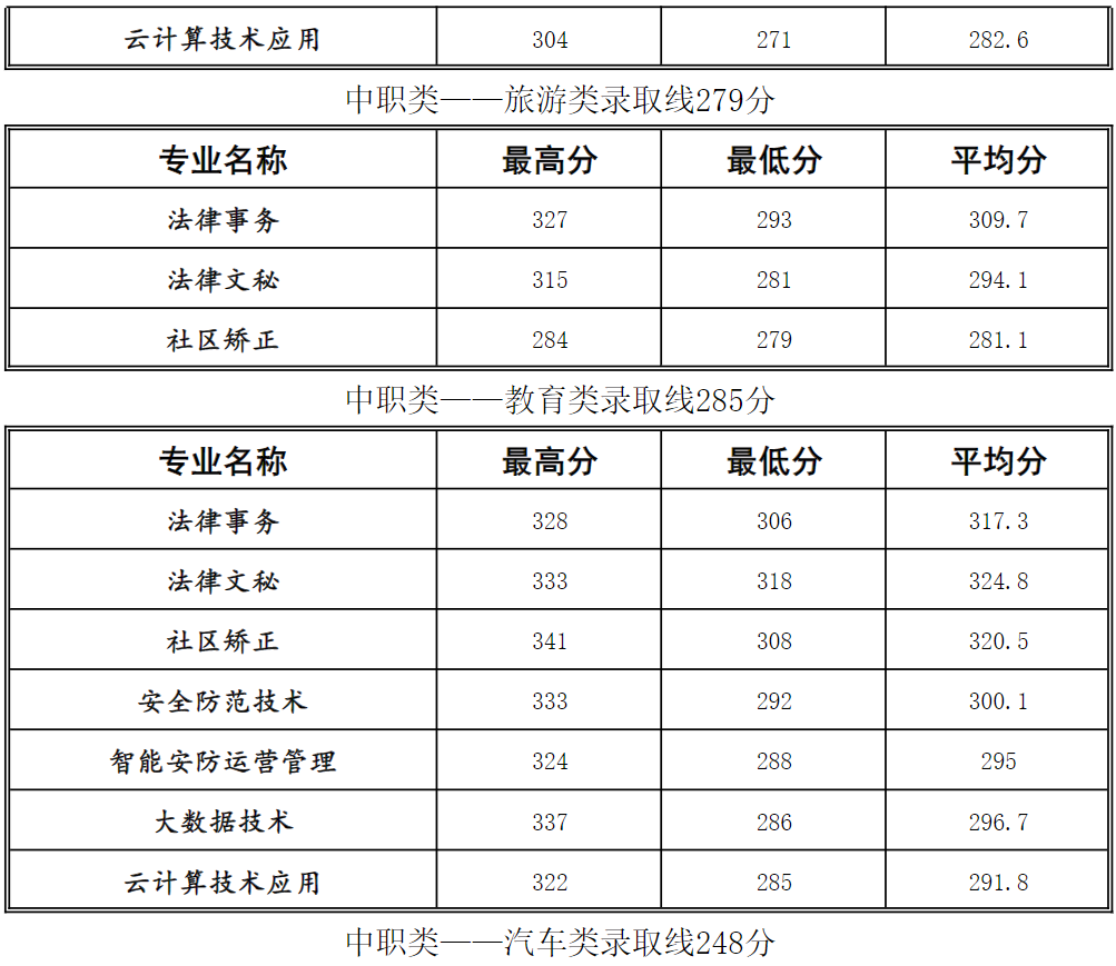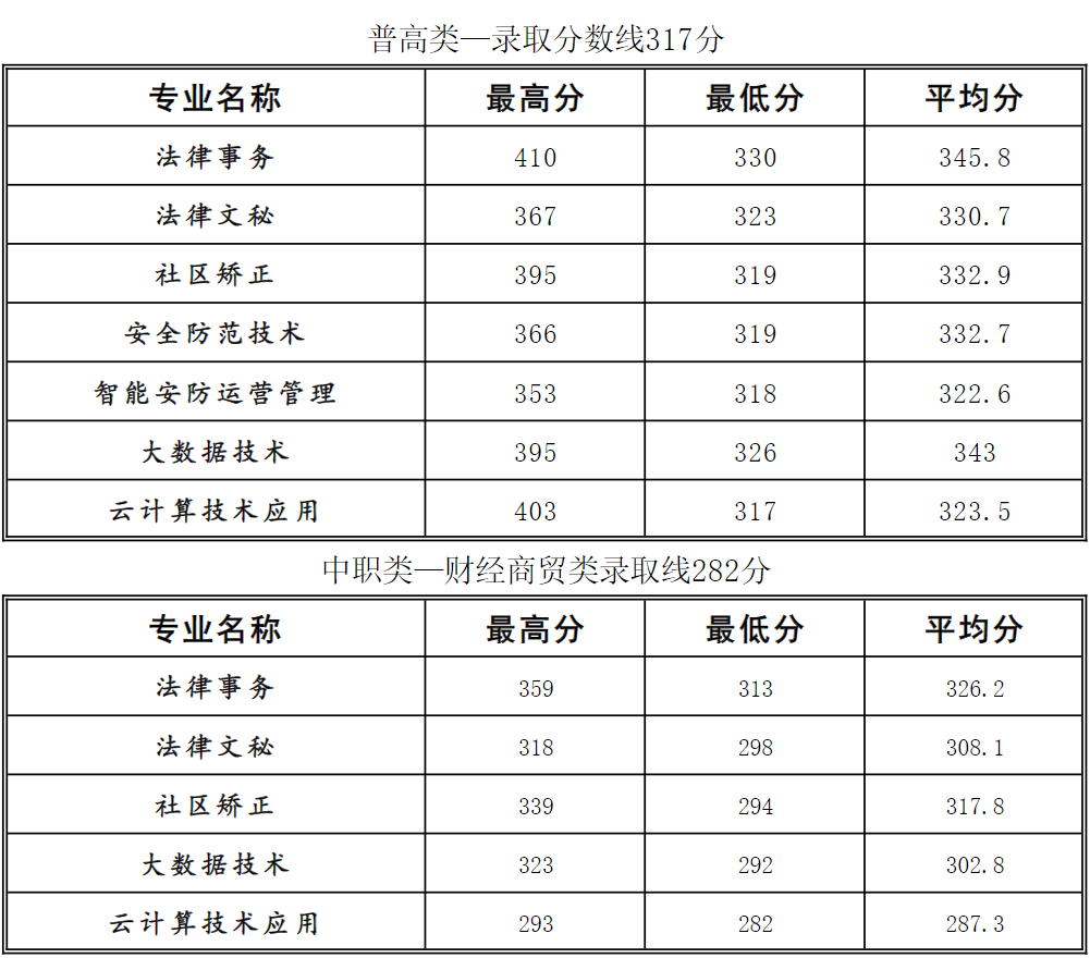 四川司法警官职业学院2024年高职单招考试各专业录取分数线