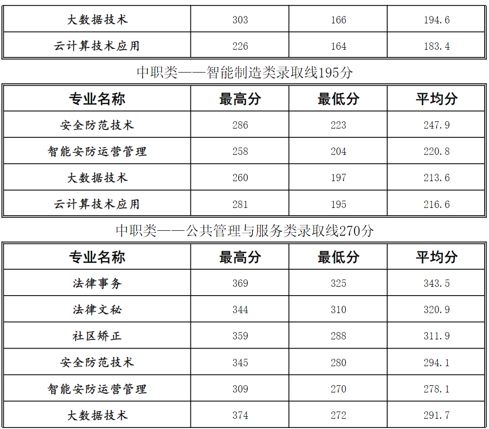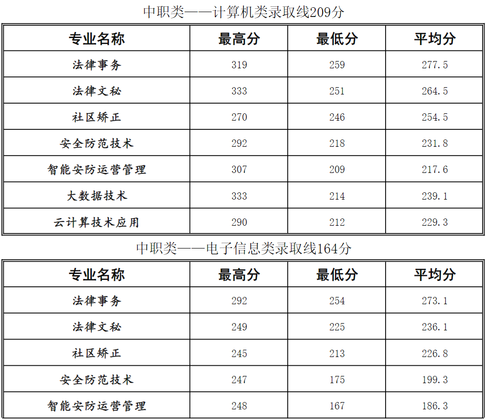 四川司法警官职业学院2024年高职单招考试各专业录取分数线:
