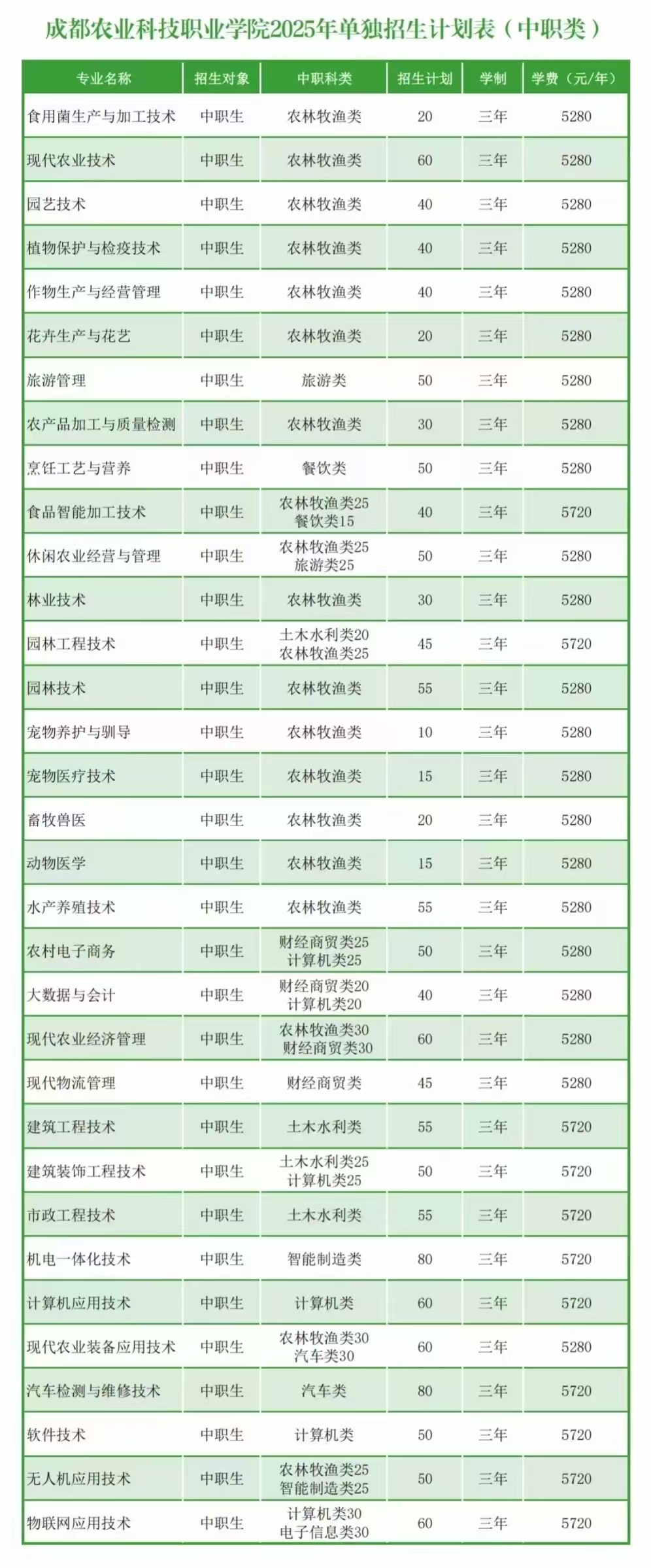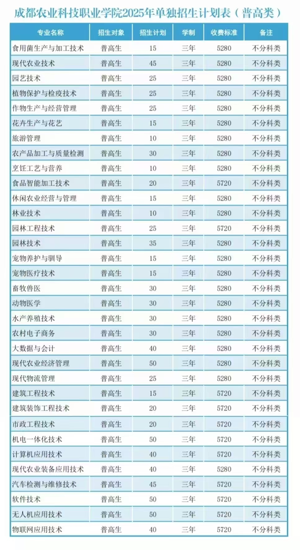 成都农业科技职业学院2025年单独招生计划表