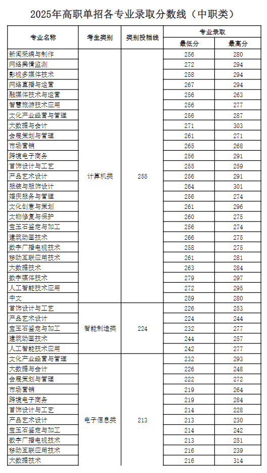 成都职业技术学院2025年高职单招录取投档最低分数线公告