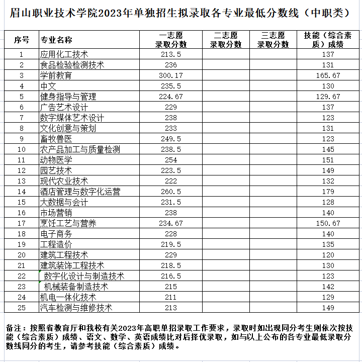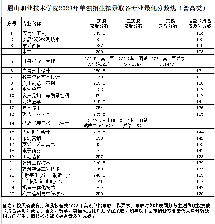 眉山职业技术学院2023年单独招生拟录取各专业最低分数线