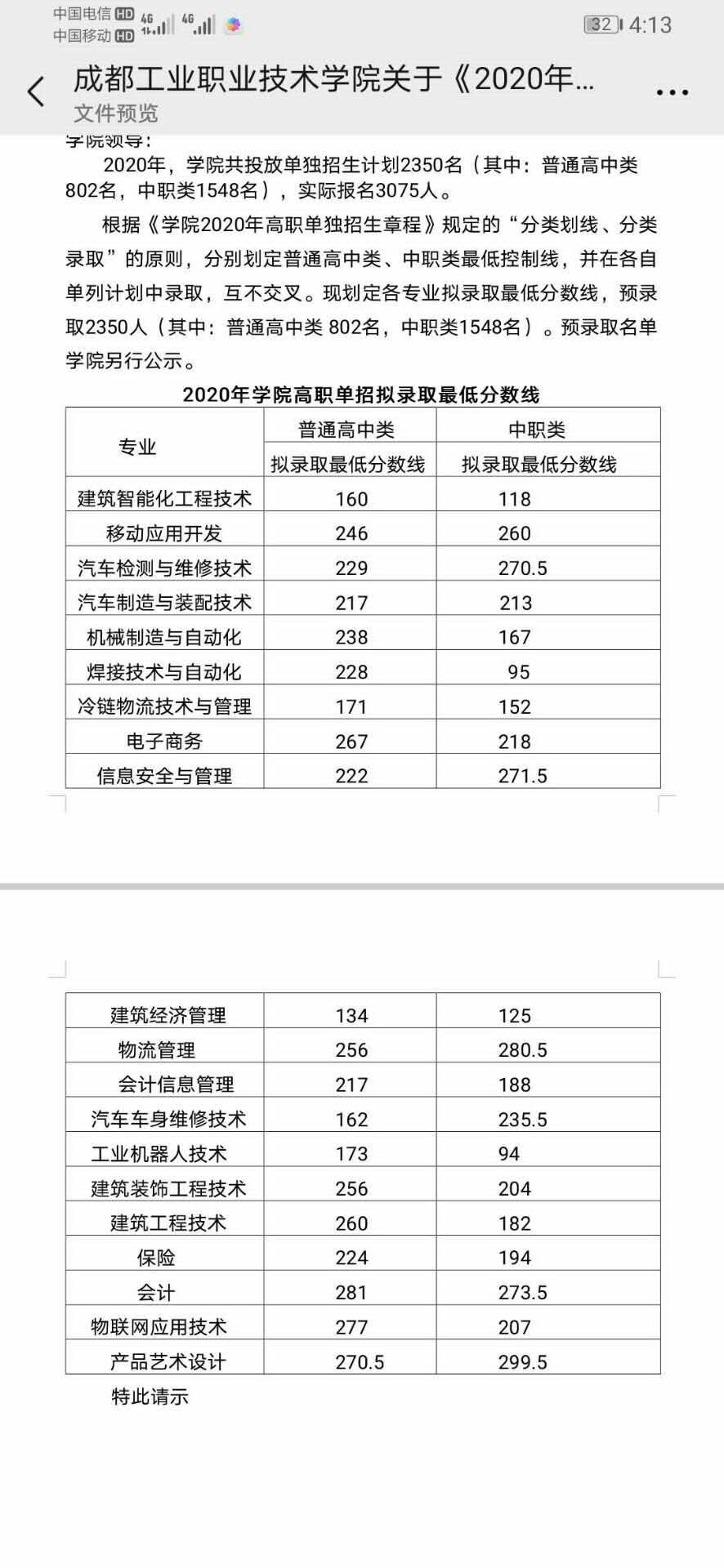 成都工业职业技术学院2020年单招录取调档线