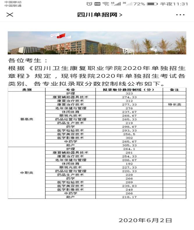 四川卫生康复职业学院2020年单招调档线