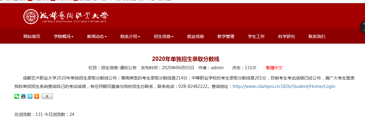 成都艺术职业大学2020年单招调档线