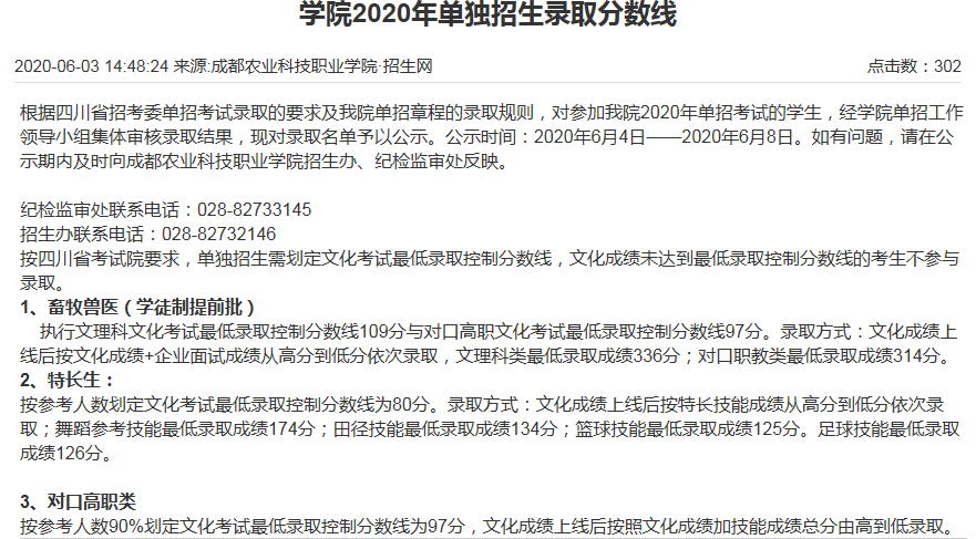 成都农业科技职业学院2020年单招最低调档线