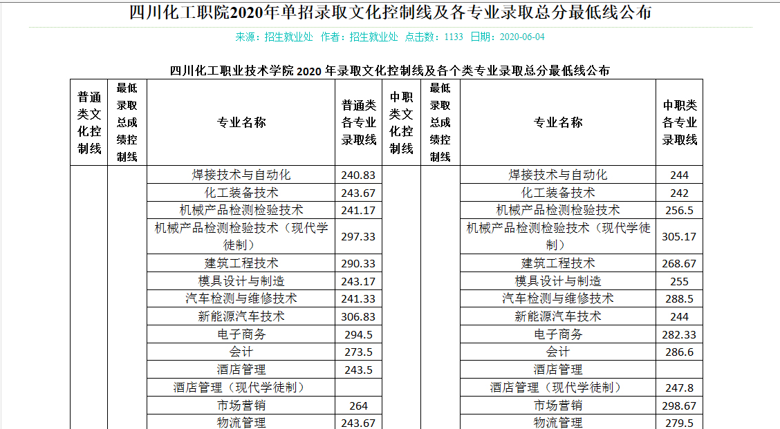 四川化工职业技术学院2020年单招最低调档线