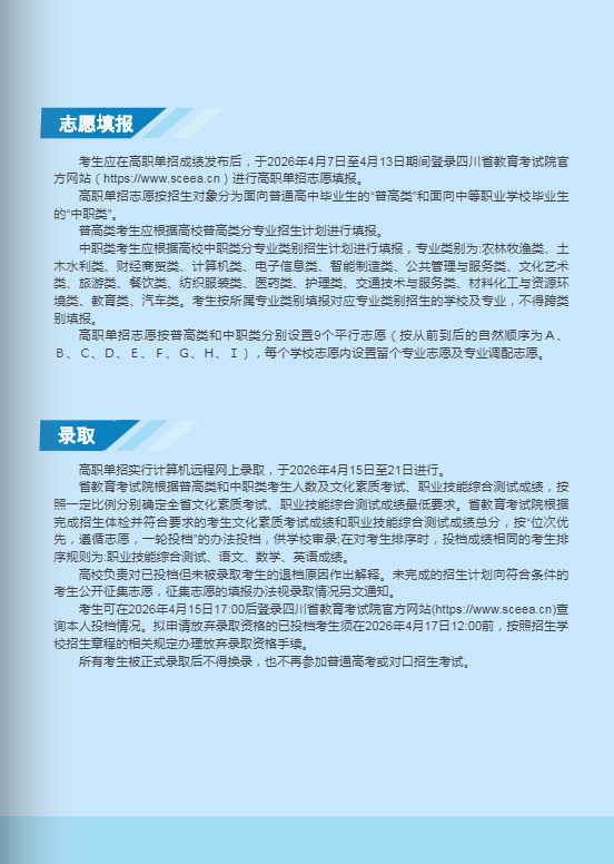 我省2026年高职单招志愿填报将于4月7日9:00开始,为让考生了解熟悉志愿填报流程,川小招为大家整理好了四川省2026年高职单招信息管理系统志愿填报电脑端、移动端操作说明,赶快往下看!电脑端考生登录四川省教育考试院官网,可点击下图中“高职单招志愿填报”或“2026年高职单招专栏”从“志愿填报入口”进入高职单招信息管
